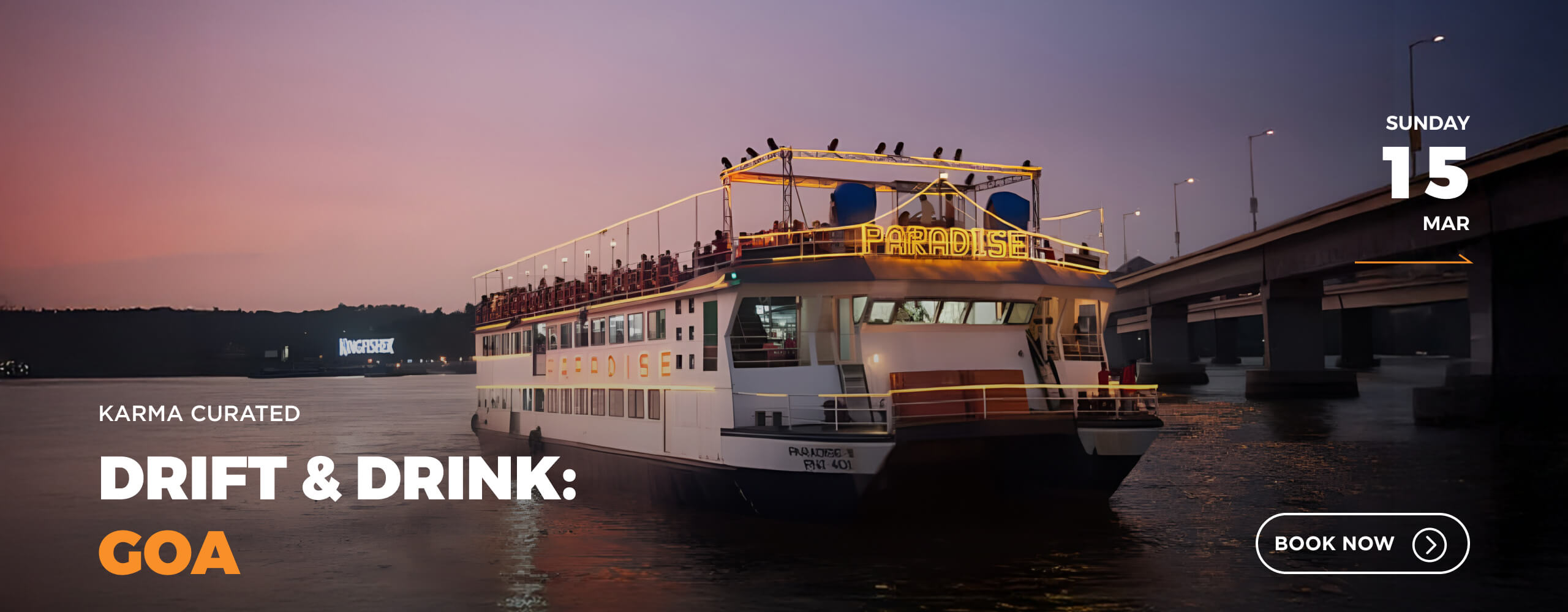 First up, Goa on 15 March. Drift & Drink is a sundowner cruise along the River Sal – golden light, live Goan music, flowing drinks and the kind of conversations that carry long after sunset.
